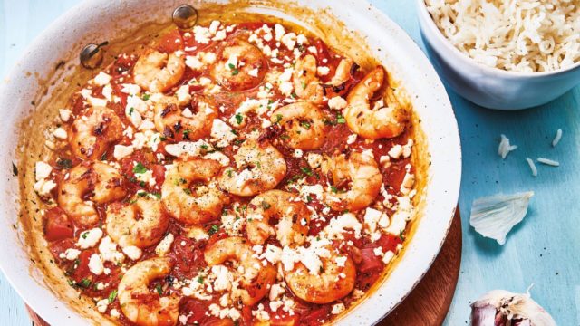 7/ Dans des assiettes dresser les crevettes à l’ail, tomates et feta, décorer avec quelques feuilles de basilic haché et servir avec le riz blanc.