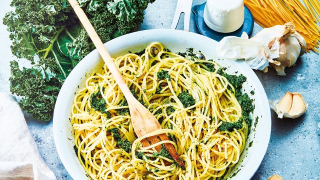 Spaghettis au pesto de chou-kale et ricotta